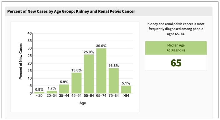 Most people with kidney cancer are older. The average age of people when they are diagnosed is 65, with most people being diagnosed between ages 55 and 74. Kidney cancer is uncommon in people younger than age 45. - Renal Cell Carcinoma 2025