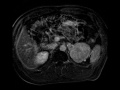MR images demonstrate a T1 hypointense, T2 hyperintense, avidly enhancing mass in the left upper quadrant, found to be separate from the adjacent left adrenal gland. This was found to represent extra-adrenal paraganglioma
