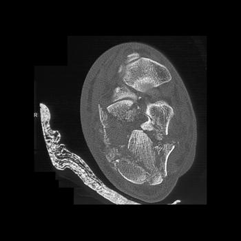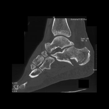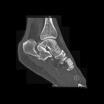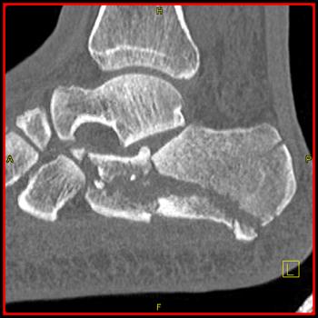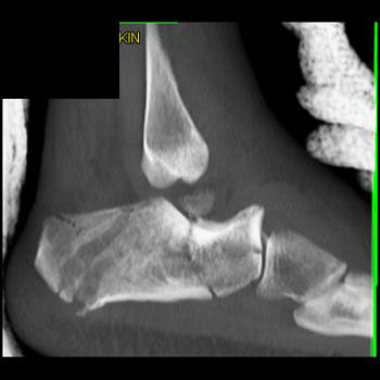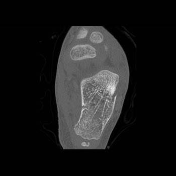 The calcaneus is the most commonly fractured tarsal bone. Calcaneal fractures are classified as intraarticular and extraarticular. The intraarticular fracturesaccount for 70-75% of calcaneal fractures and carry a worse prognosis. The inciting trauma is usually a fall or motor vehicle accident, and these fractures are bilateral in 10% of cases. Concomitant ipsilateral lower extremity fractures are present in 20-46% of cases, and spinal fractures in 10-30%. Extrarticular fractures (Figure: extraarticular fracture of calcaneus) account for 25-30% of calcaneal fractures, and are the sequela of a twisting injury. Anatomic regions affected include the anterior or medial process, the sustentaculum tali, the body or the tuberosity. Severe fractures are readily evident on conventional radiographs; however, CT is essential for elucidating the extent of injury. The intraarticulur fractures are often comminuted and may be displaced. CT is also used for follow up after fracture treatment. CT is very helpful for detecting fracture malunion or nonunion . In addition, the presence and extent of secondary osteoarthritis is readily detected by CT. Several features of intraarticular fractures which can be elucidated on CT have been shown to correlate with the outcome. A central depression fracture has a worse prognosis than a tongue-type fractures, but a better prognosis than a comminuted fracture. An unsatisfactory result is more likely in the setting of subtalar incongruity, decreased fibulocalcaneal space and osteoarthrosis of the talonavicular joint and the ankle.