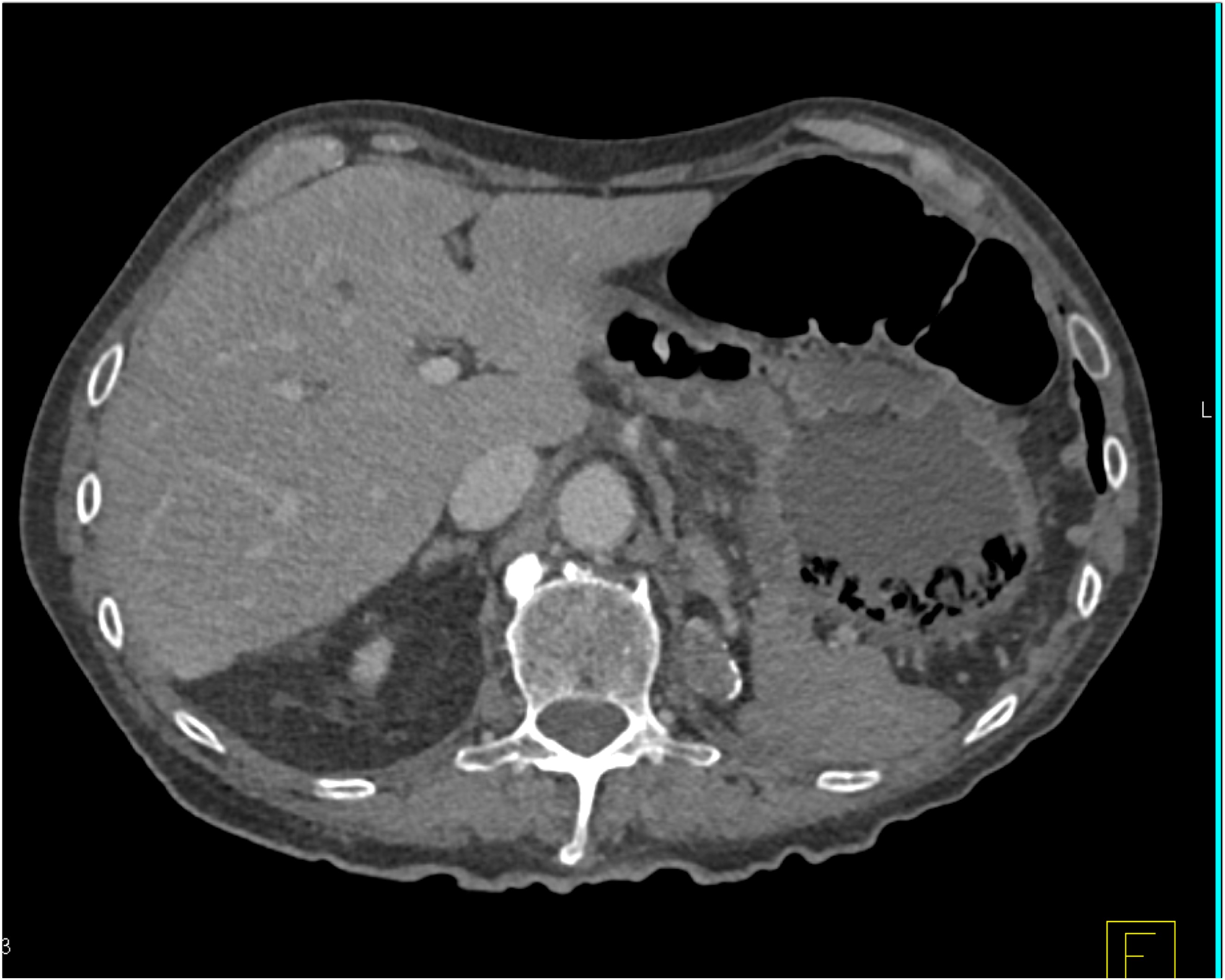 8) In this patient with RUQ pain and no history of trauma the best diagnosis is?